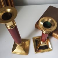Set of two mismatched vintage brass candlestick holders. The lower one has a wooden middle part whereas the taller one is full metal.