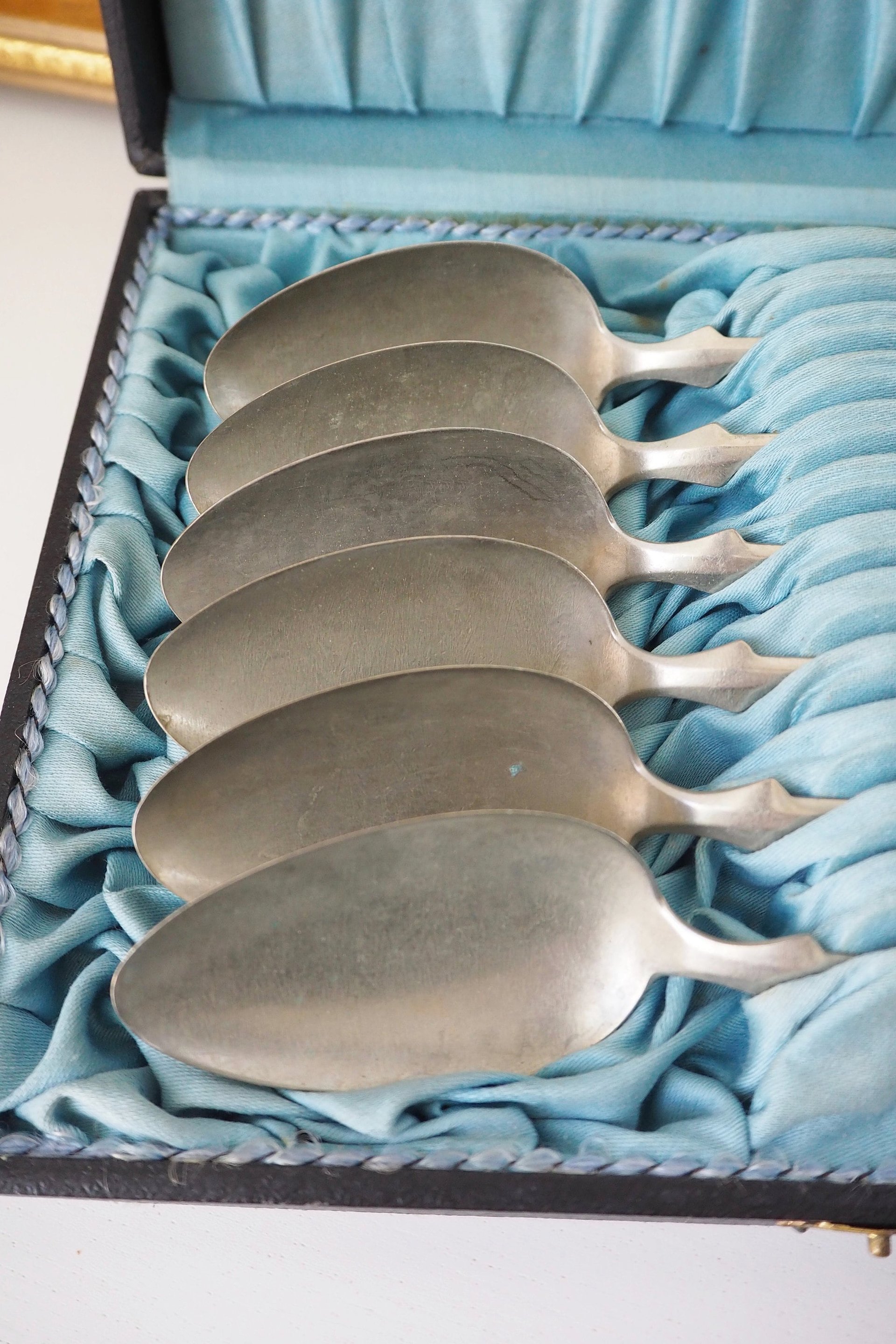 Set of six vintage alpacca silver tablespoons with the classic Musla pattern. Comes with the beautiful box shown in photos.