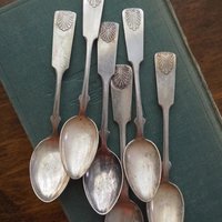 Set of six small, slightly mismatched vintage alpacca silver teaspoons with the musla motif. Some of them have small engravings on back of the handle.