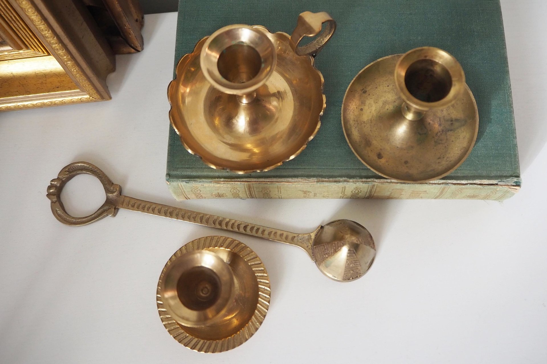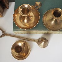 Set of three small mismatched vintage brass candlestick holders and a candle snuffer.