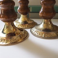 Set of three vintage candlestick holders, gold plated with a wooden detail. Made in England.