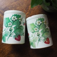 Set of two vintage tin containers with a lid. Both have the same beautiful strawberry motif, one has slightly more faded colors than the other. Made in England, designed by Louise Carling.