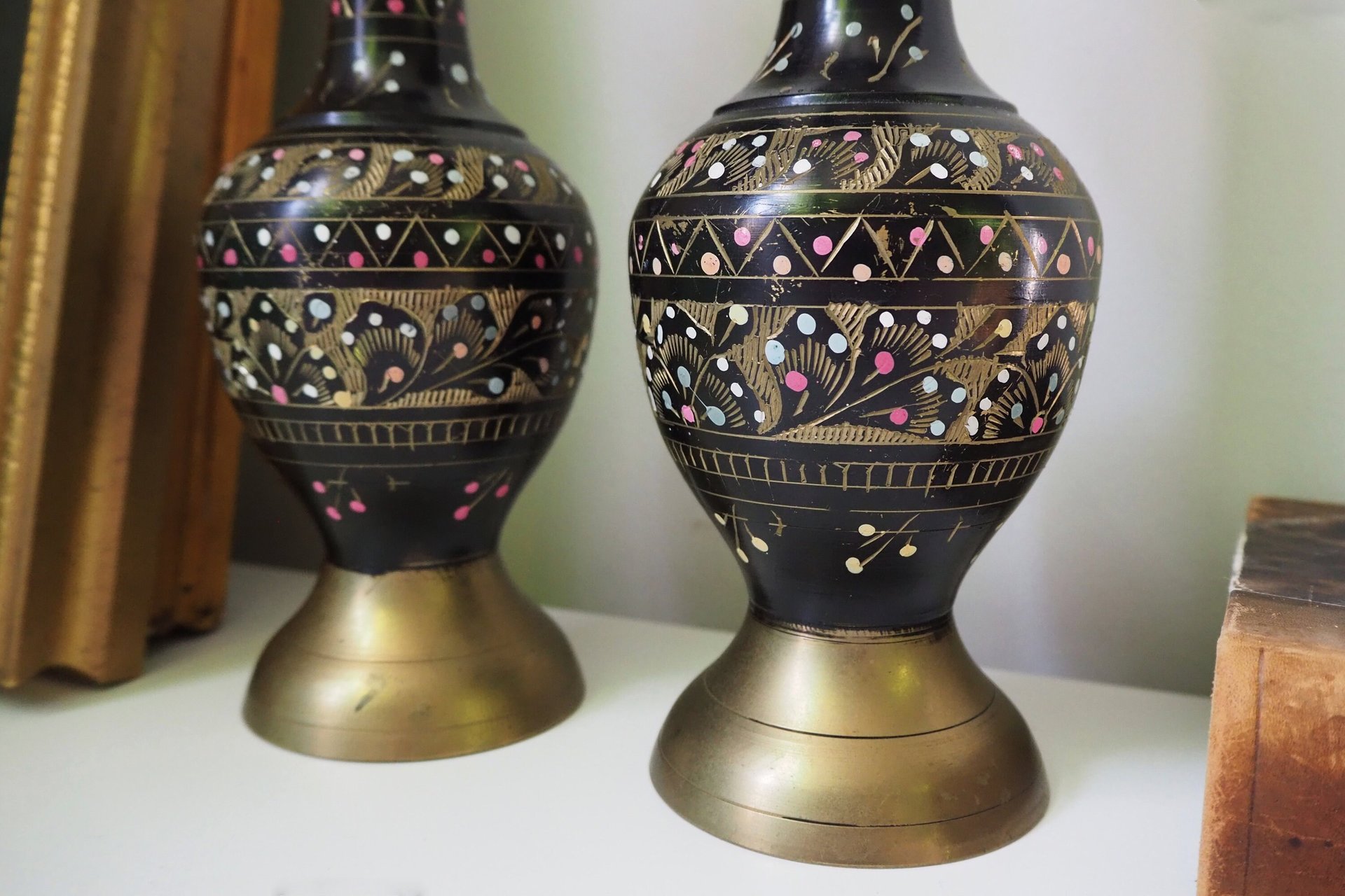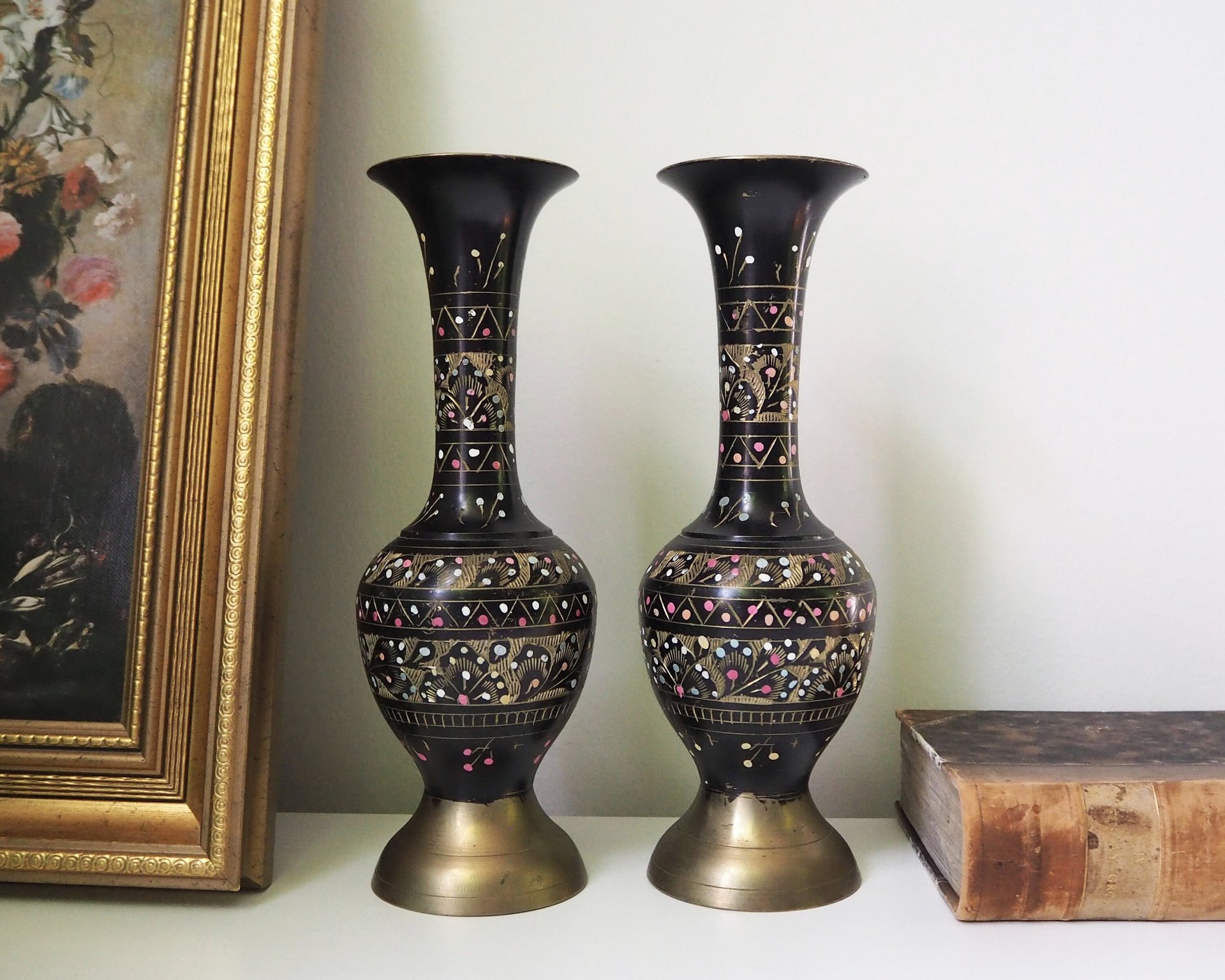 Set of two vintage vases | Brass vases | Matching vintage vases | Etched brass and black vases | Pastel vases