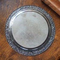 Vintage alpaca/new silver plate, made in Finland. Has a lot of patina and a small engraving in the middle. Also has the date 22.3.1954 engraved on the back.