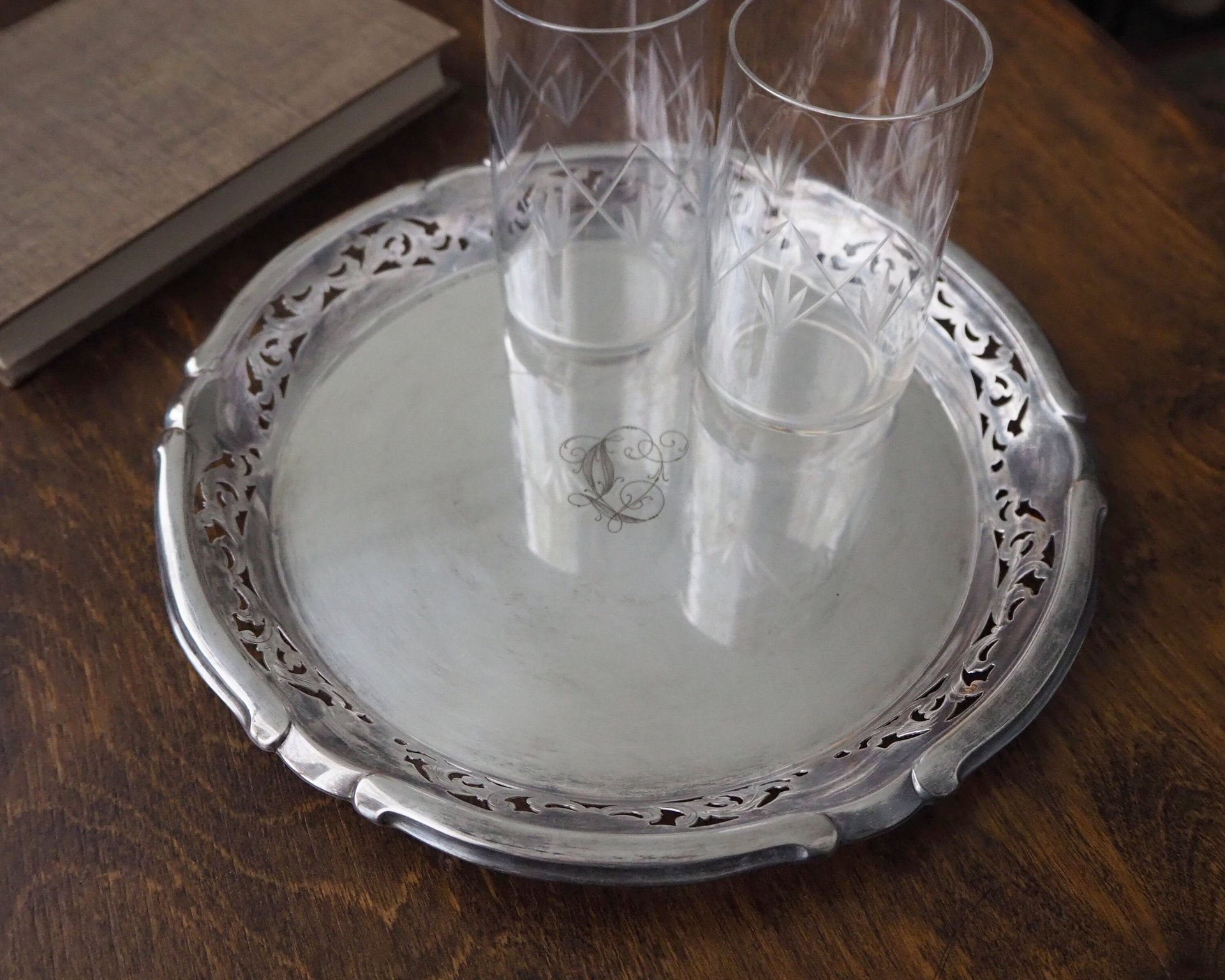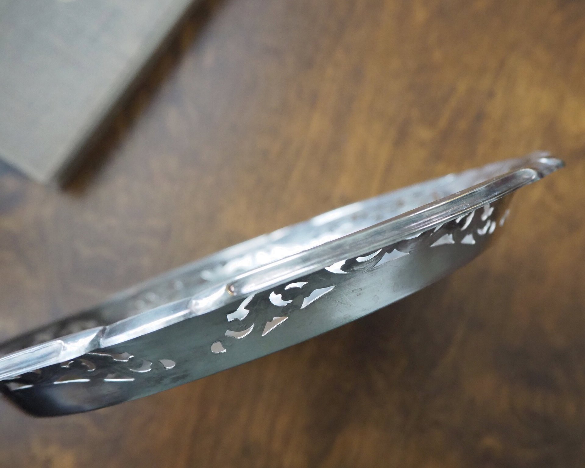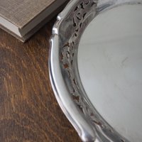 Vintage alpacca silver plate, made in Finland. Has cut-out ornaments and a small engraving in the middle.