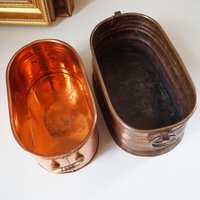 Set of two mismatched vintage copper planters. Both have an oblong shape and small handles on both ends.