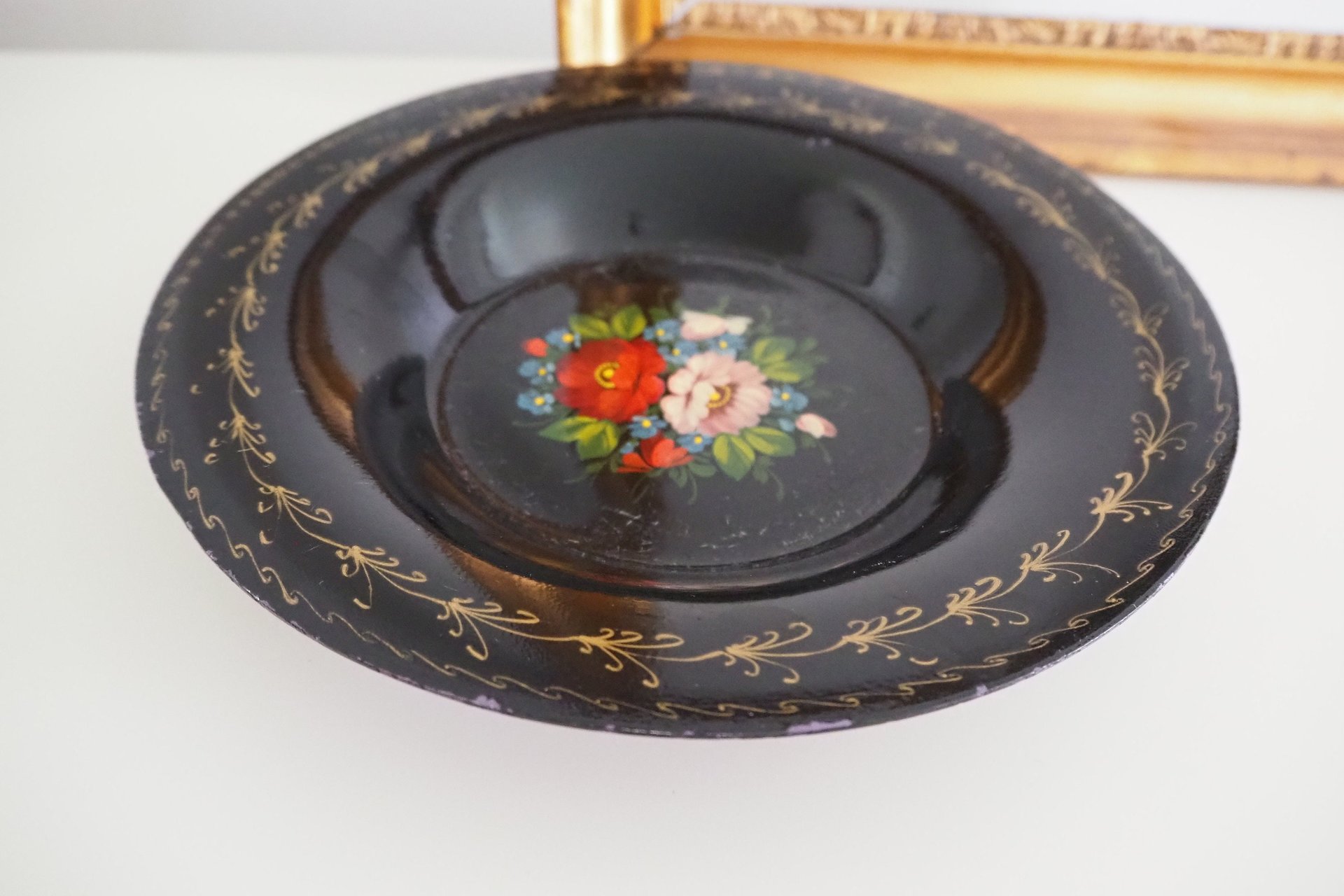 Adorable vintage Russian metal plate with handpainted floral motif in Zhostovo style. Hang it on your wall as a decorative plate or use as a bowl.