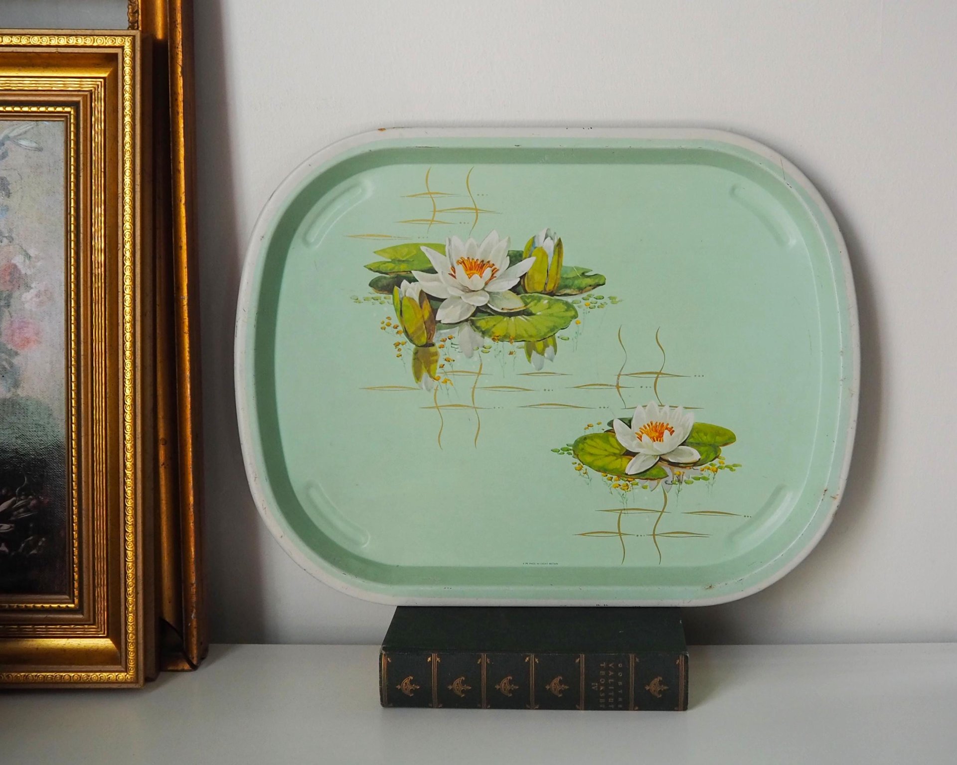 Lovely vintage tin tray with a beautiful water lilies on a mint green base. Made in England.