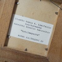 Vintage framed etching of Finnish artist Albert Edelfelt's illustration. The original illustration was made by him in the 1890s to accompany the book The Tales of Ensign Stål. The illustration is etched on silver, marked 830, R8 (the latter means it was made in 1994). Wooden frame. Made in Finland.