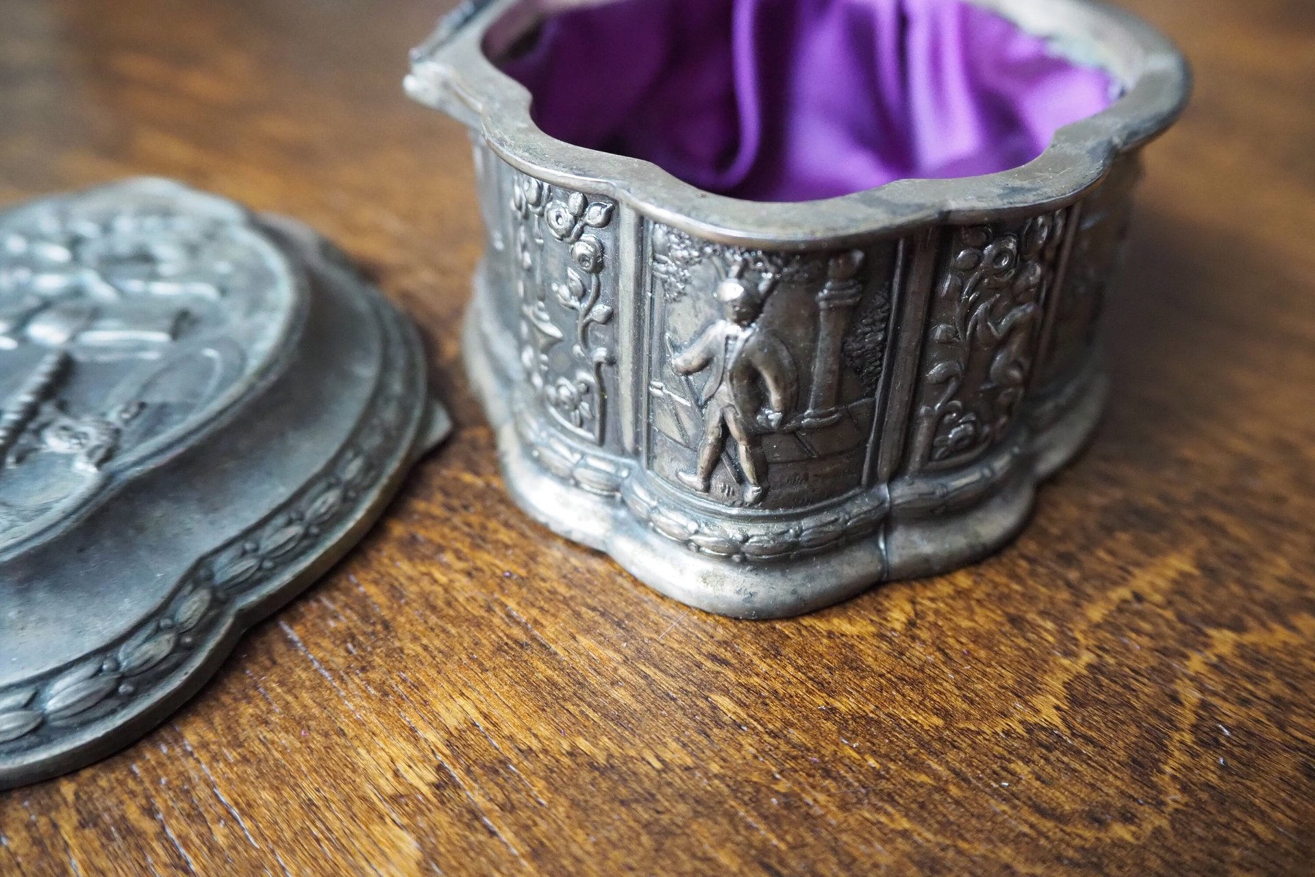 Charming vintage silver plated box, perfect for jewelry or small trinkets. Beautiful patina on the surface, the interior is purple fabric.