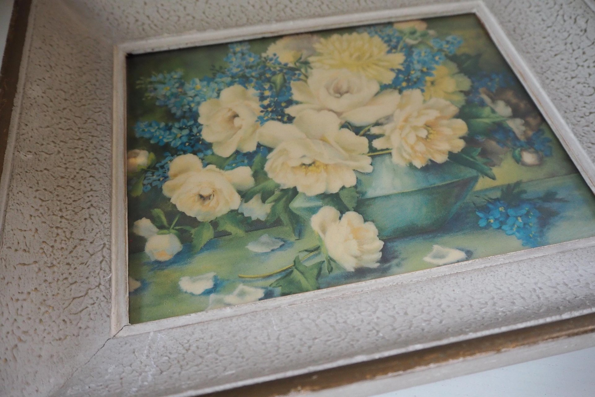 Vintage framed art print with a beautiful yellow floral arrangement. Has a glass and a wooden frame.