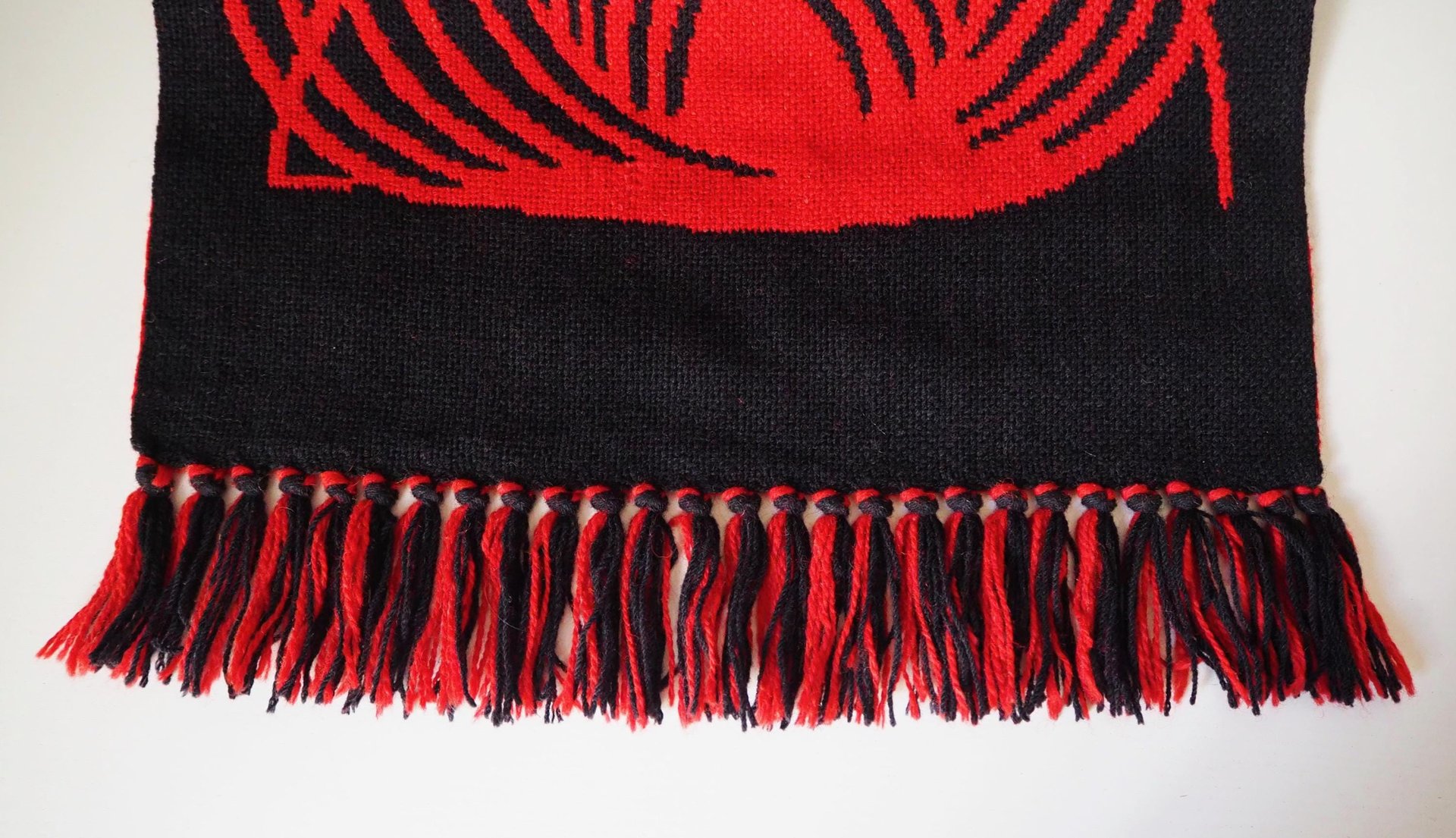 Vintage wall hanging with a unique geometric motif and a small fringe. Handmade with wool yarn. Can be hung up with either side visible.