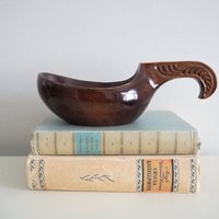 Charming vintage wooden bowl. Handcarved, dark lacquered wood, shaped like a scoop or ladle. Great for storing small items or serving snacks in. There's a stamp on the bottom but it's illegible.