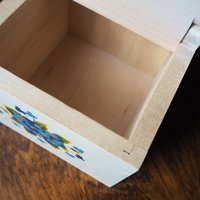 Vintage wooden salt box with a hinged lid. Handpainted blue flowers in the front. You can hang the box on your wall or just place on the kitchen counter or other surface.