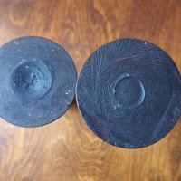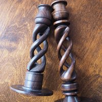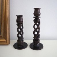 Pair of vintage candlestick holders, beautiful dark wood. One is a bit lighter than the other.