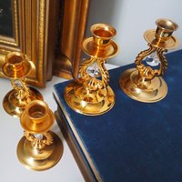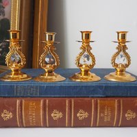 Set of four vintage candlestick holders | Gold plated crystal candlestick holders | Small gold plated candlestick holders | Turun Kristalli