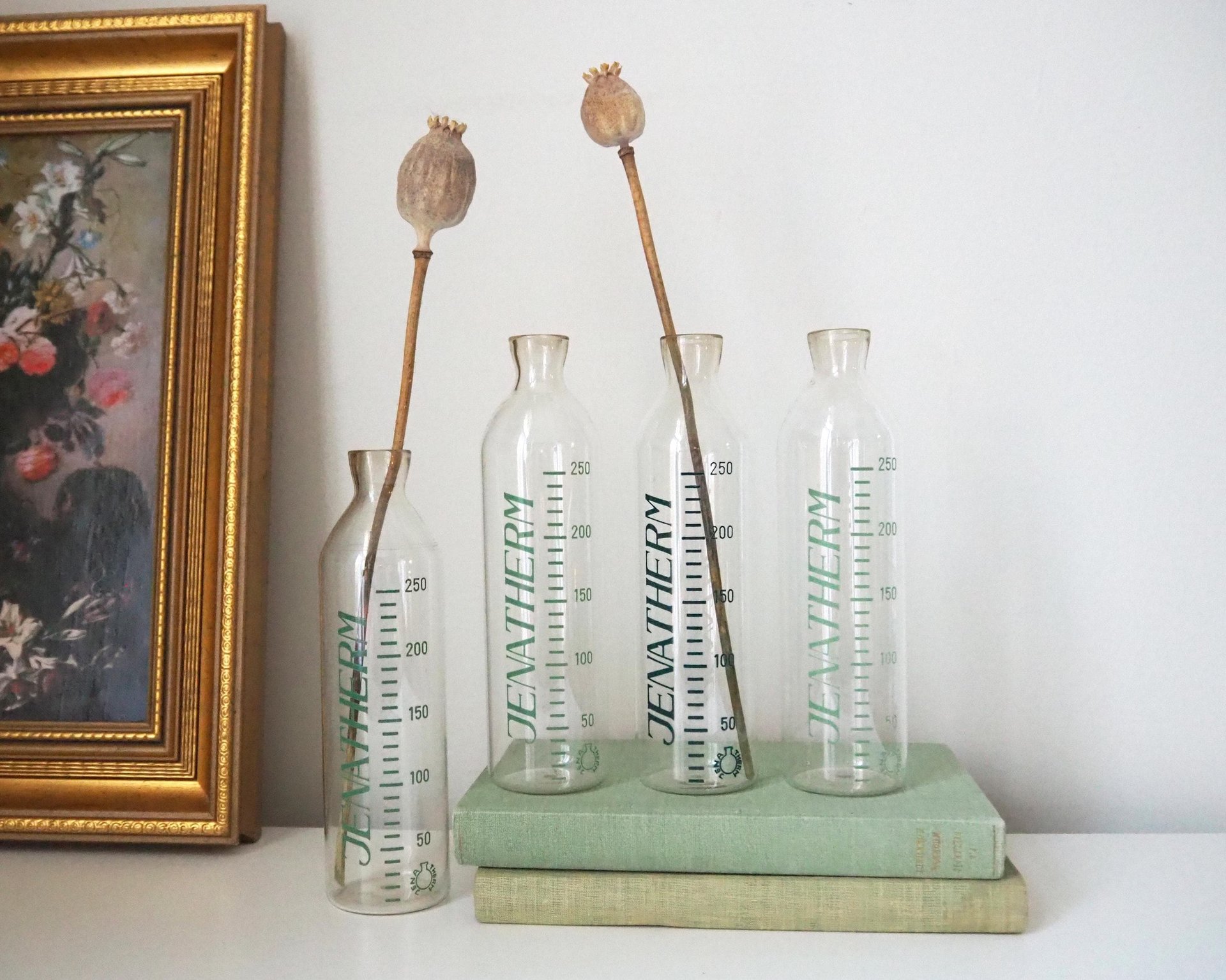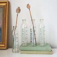Set of four vintage glass bottles | Vintage Jenatherm laboratory bottles | Vintage apothecary bottles | Vintage glass vases