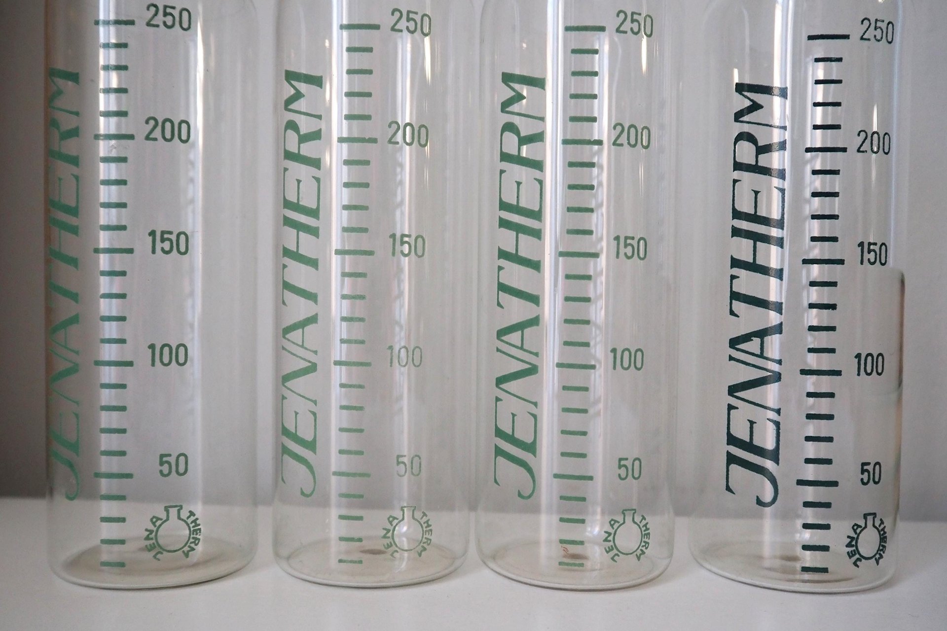 Set of four vintage Jenatherm laboratory bottles, made in Germany. All four have a volume of 250 ml.