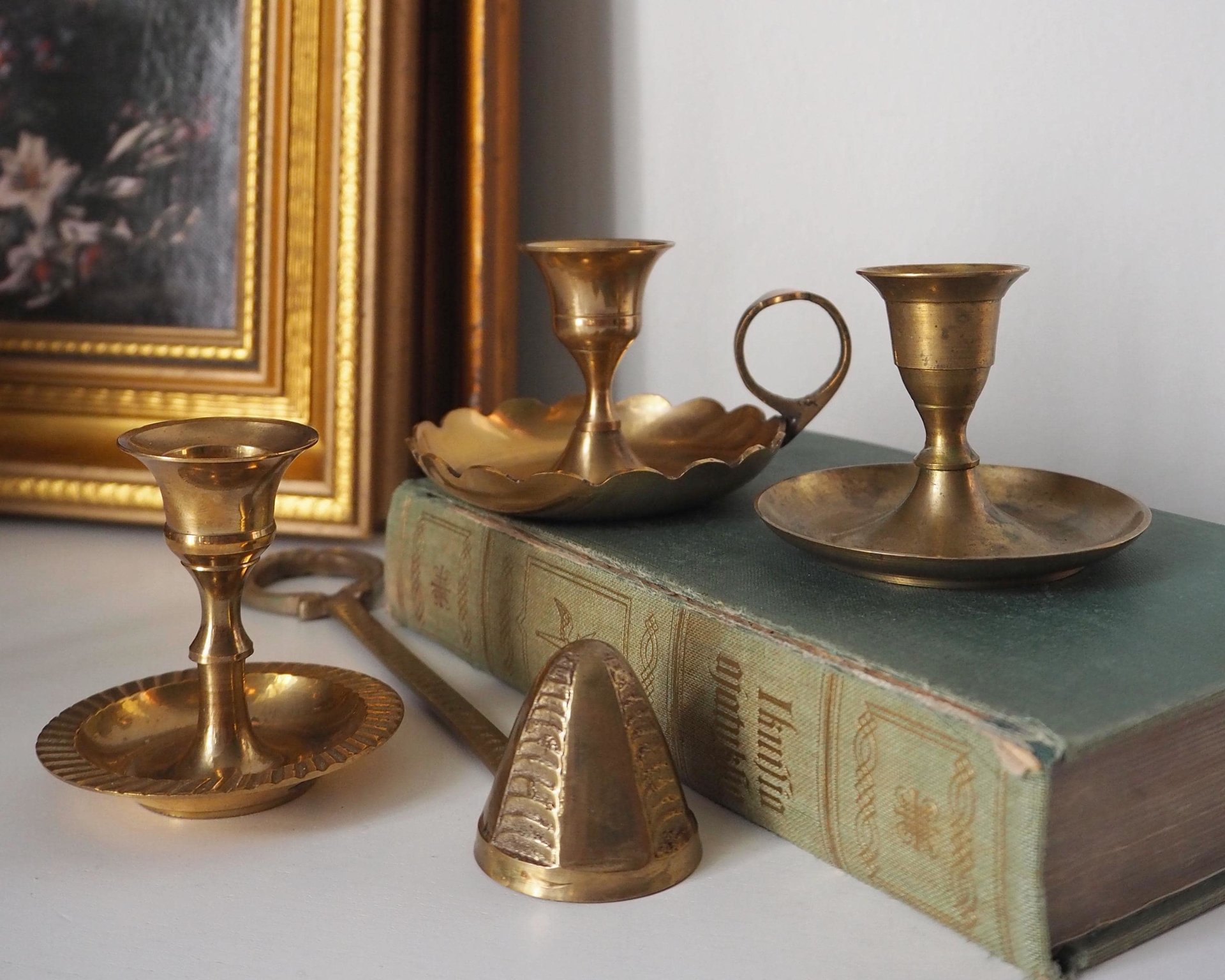 Set of three small mismatched vintage brass candlestick holders and a candle snuffer.