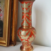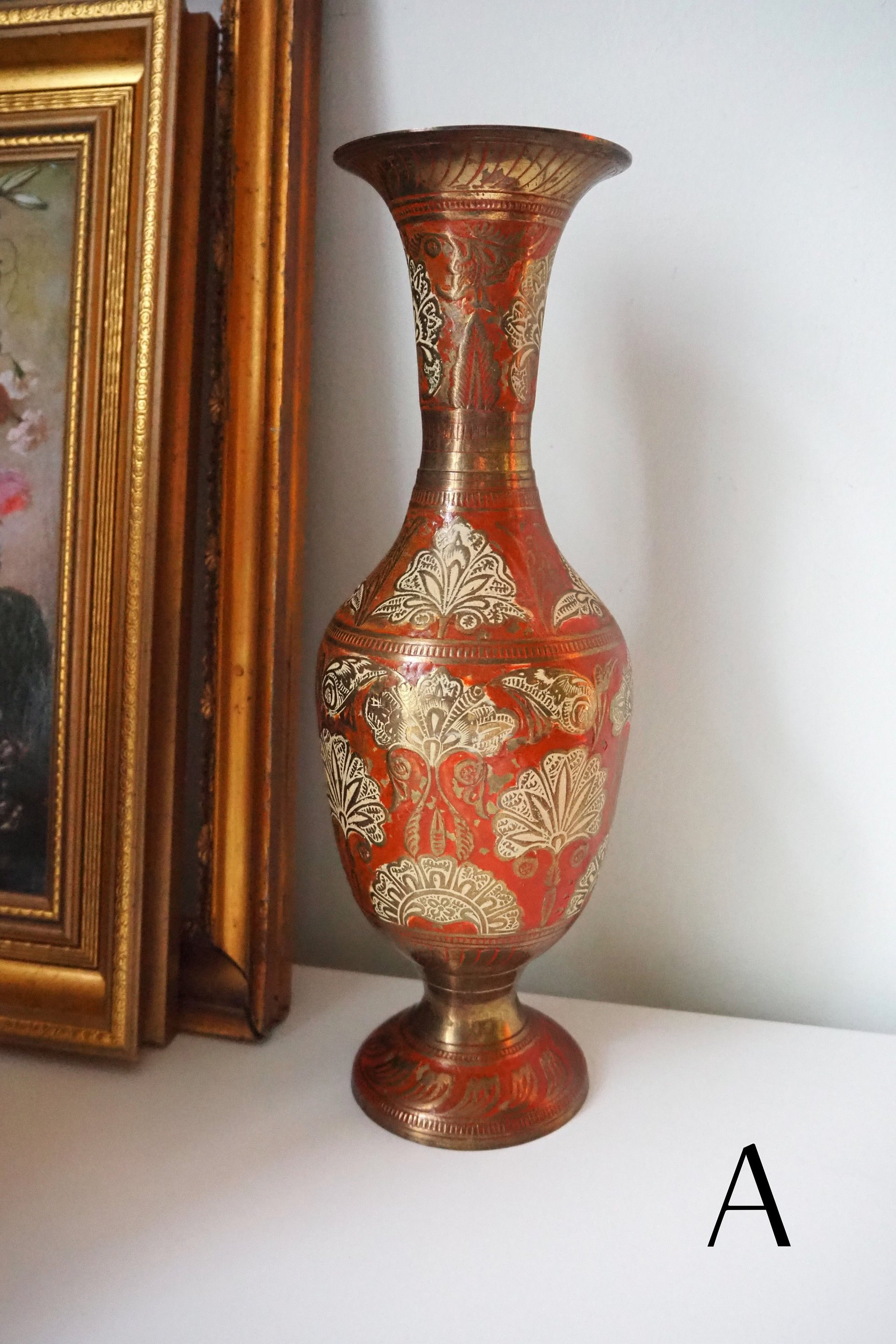 Vintage brass vase | Large enamelled brass vase | Vintage brass vases | Tall brass vase | Vintage vase | Brass and red vase