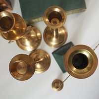 Vintage candlestick holder set. Includes four mismatched brass candlestick holders and a brass candle snuffer with a little jingle bell.