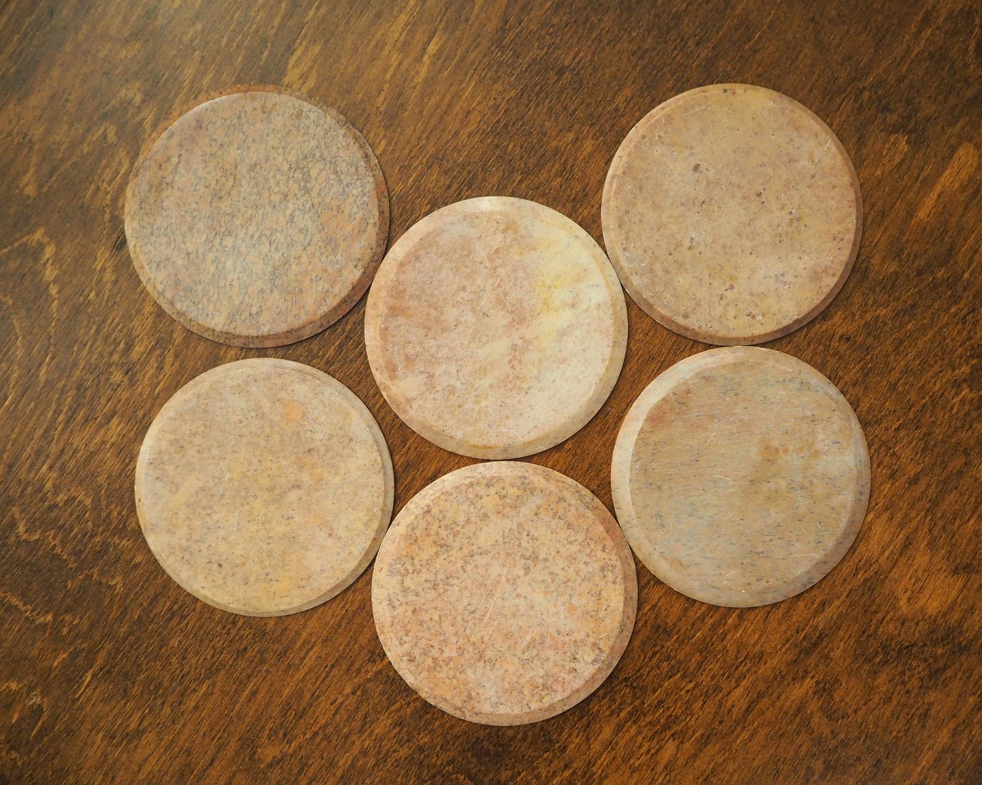 Set of six gorgeous vintage stone coasters with mother of pearl inlays.