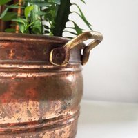 Vintage copper planter with brass handles. The planter is oval shaped and has some beautiful patina and verdigris.
