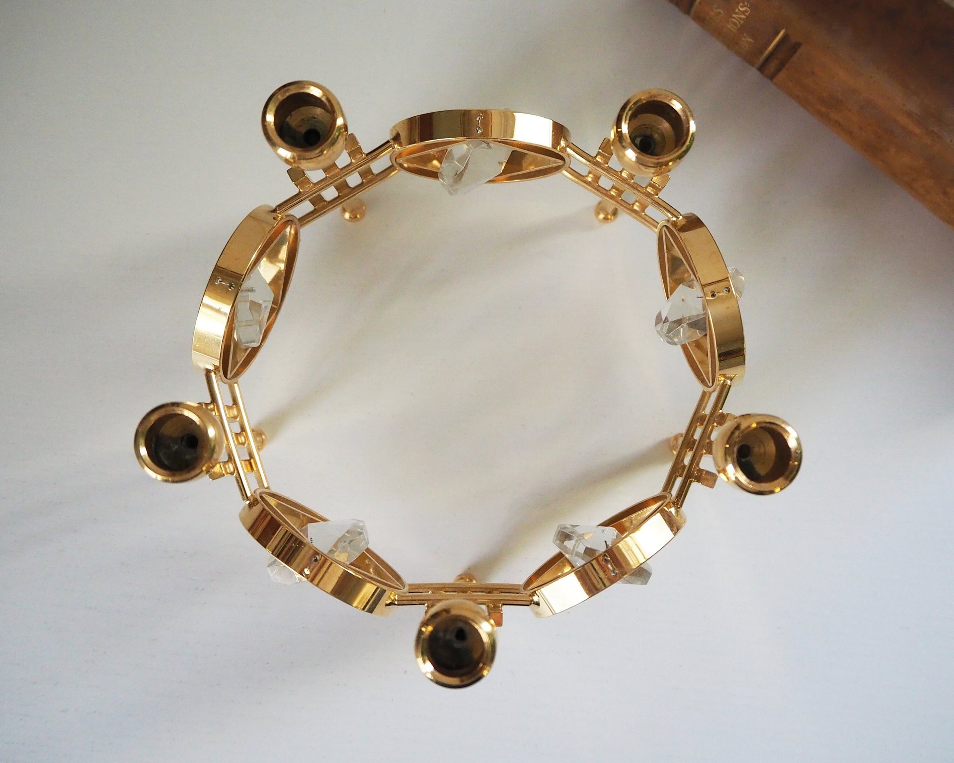 Beautiful vintage gold plated candelabra for five small candles. Made in Finland by Turun Kristalli.