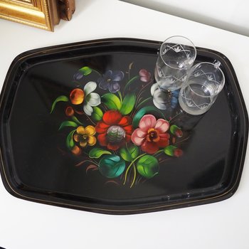 Lovely vintage metal tray with a beautiful floral motif on a creamy white base. Nice and sturdy, weighs about 1.3 lb | 600 grams. Made in England.