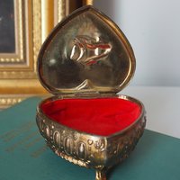Charming heart shaped vintage jewelry box. Has three tiny feet, a hinged lid and is lined with red velvety fabric inside.