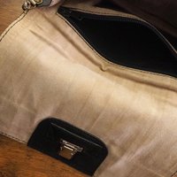 Lovely vintage leather wristlet bag. The wrist band is detachable and can be attached on either side of the bag. Has a light beige velvety lining inside and two small pockets, one of which has a zipper.