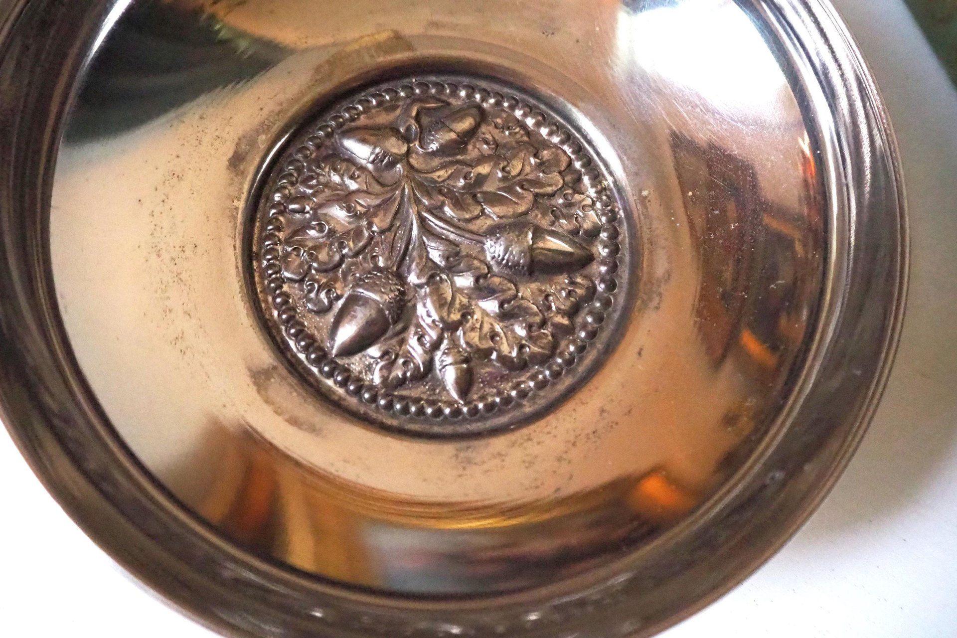 B. Round dish with three tiny feet and an acorn motif, diameter approx 5.7 inches | 14.4 cm.