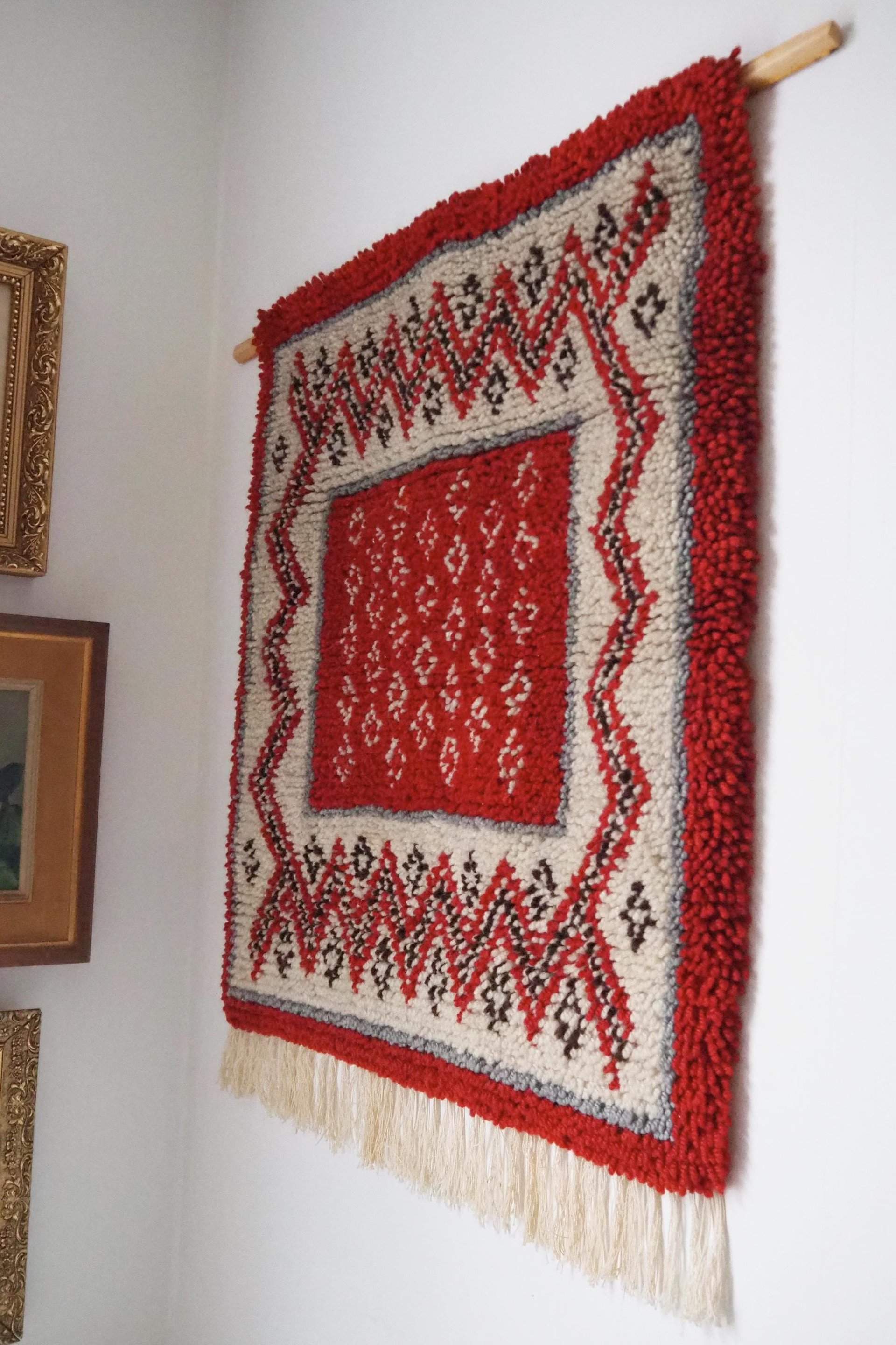 Gorgeous vintage woollen Rya rug with a geometric pattern and a thin fringe. Has a pathway behind on top where a hanging rod can be inserted if needed, no hanging rod included.