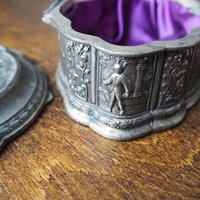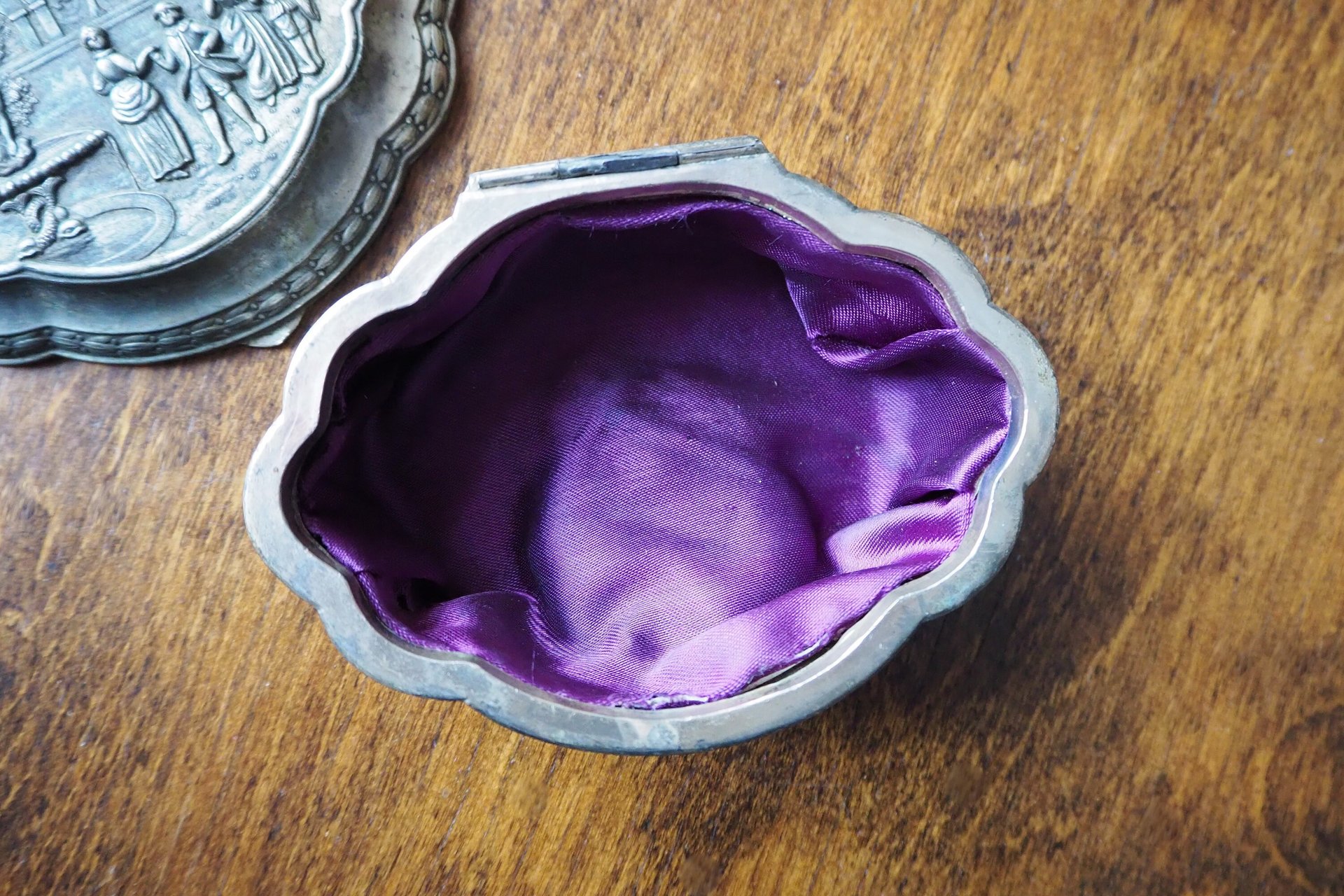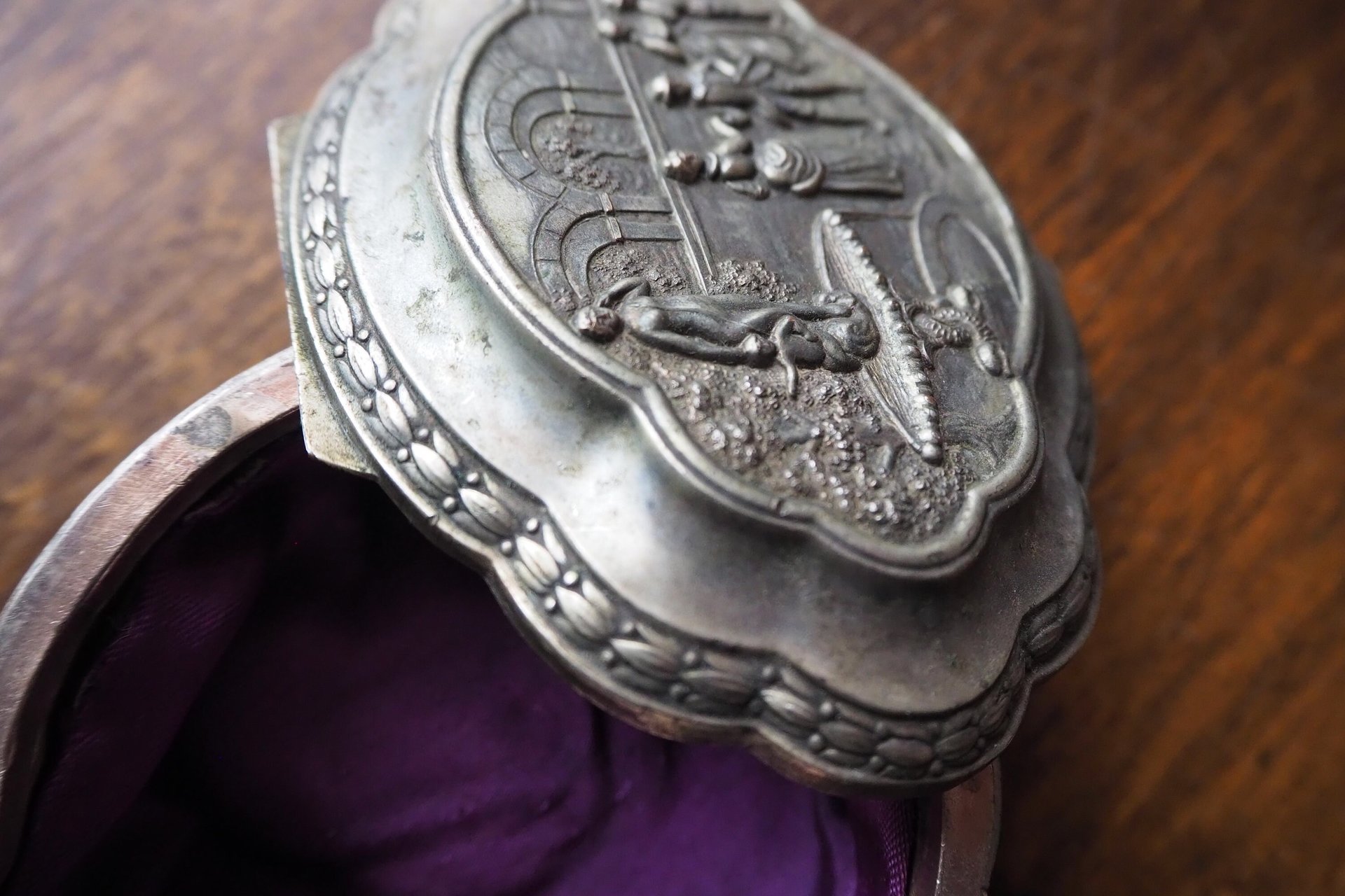 Charming vintage silver plated box, perfect for jewelry or small trinkets. Beautiful patina on the surface, the interior is purple fabric.