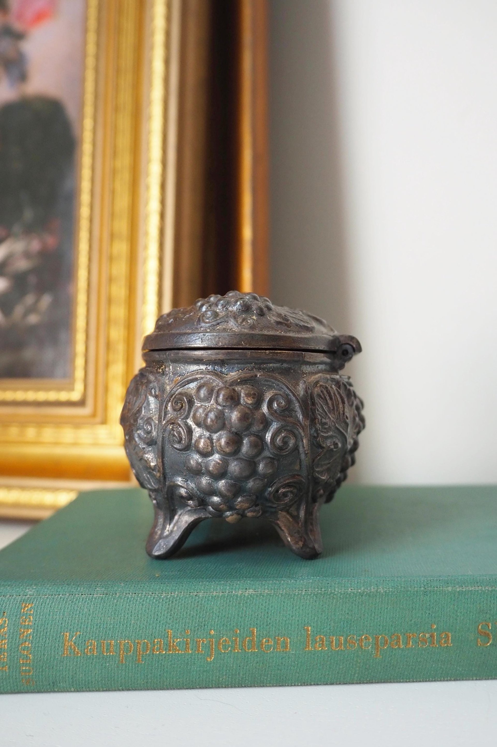Charming vintage silver plated box with a hinged lid, perfect for jewelry or other small trinkets. Beautiful patina on the surface, has a fabric lining inside. Made in Sweden.
