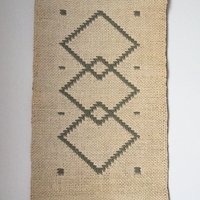 Vintage jute wall hanging with a simple geometric motif and a small fringe. Can be hung up with either side visible.