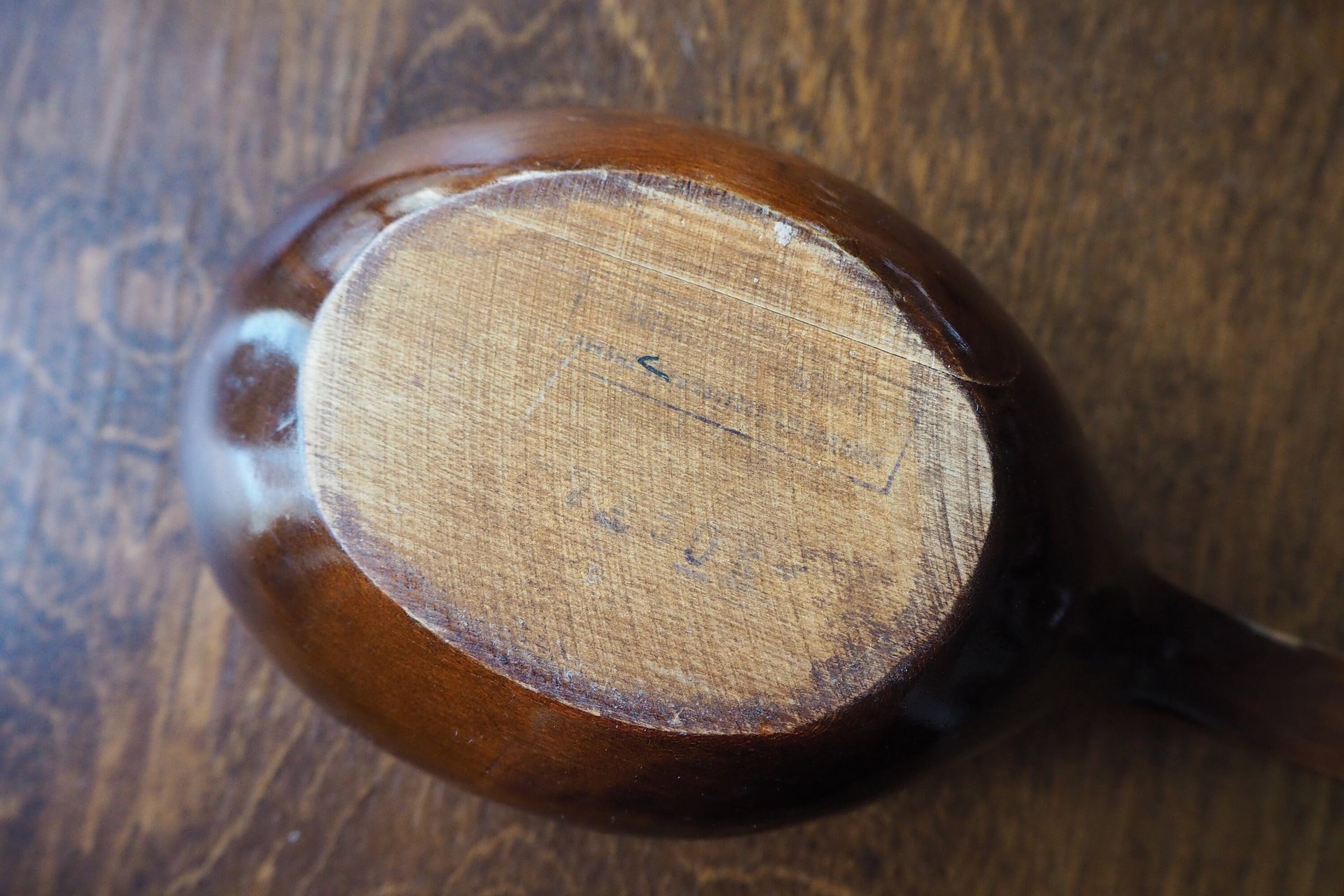 Charming vintage wooden bowl. Handcarved, dark lacquered wood, shaped like a scoop or ladle. Great for storing small items or serving snacks in. There's a stamp on the bottom but it's illegible.
